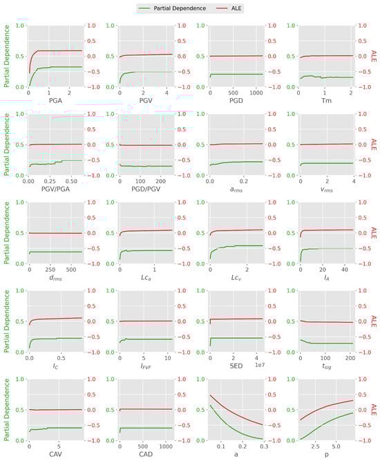 Figure 7 summarizes both PDPs and ALE results of the model trained with 20 input features, while no restrictions are imposed regarding the lower bound of rocking rotations or the frequency parameter of freestanding blocks. As Equations (6)–(9) demonstrate, the PDP and ALE approach have common elements, but also some differences. Most notably, the two quantities do not have the same scale, which is why each of the two is shown with its own y-axis in each subplot. The most dominant effect is presented by the structural features and p. As expected, the slenderness negatively impacts the target variable across its entire range. On the other hand, the frequency parameter presents a reverse effect. A common trend among all the input features that characterize the ground motions is that they affect the response up to a certain IM level. Beyond that barrier, the effect is negligible. The most impactful IMs are the PGA, PGV, , , and .