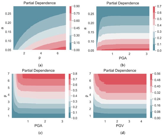 PDP values for the total dataset. (a) Combined effect of and p. (b) Combined effect of and PGA. (c) Combined effect of p and PGA. (d) Combined effect of p and PGV.