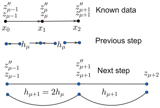 If we abort the trial (current) step . i.e., we do not seek for approximation in but in , where is the halved step (i.e., the new step) used for advancing the solution finally. Then we use on and some appropriate approximations of to apply methods with the form (3) after proper adjustment of the indices. See Figure 2 for a graphical explanation.