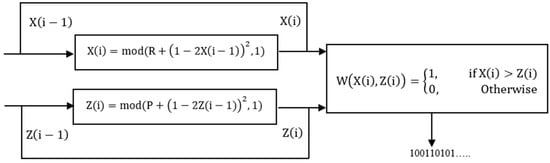 This section presents a technique for generating pseudo-random binary sequences using a threshold simple function that is combined with real numbers of modified quadratic chaotic maps. The following steps are used for this purpose, as illustrated in Figure 2: