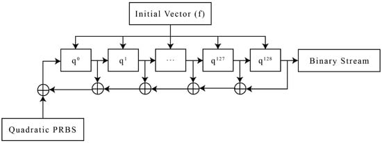The design of the HPRBS is based on an LFSR of length 128 bits and modified quadratic chaotic maps since many PRNG-based LFSRs are not resistant to attacks and provide information about the secret key. This flaw is overcome by using the XOR operation in which random bits obtained by a modified quadratic map binary stream (Section 1.2) are Xored with LFSR feedback in every clock cycle to generate the random binary number stream . The LFSR tap positions are decided by the primitive polynomial The total keys required for HPRBS are , where denotes the input vector in LFSR. The key space for the LFSR of 128 bits is The flow diagram of Figure 3 demonstrates the whole process of HPRBS.