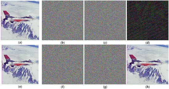 For any cryptosystem, security analysis of key sensitivity is very important in order to investigate the robustness. It helps to identify cryptosystem security against attacks like brute force. Key sensitivity plays a vital role in cryptosystem security. Cryptosystems with a high level of sensitivity offer security for similar plain images, as the ciphered images are completely altered by slight changes in key pairs if an attacker is trying to hack. The first round of encryption is performed by a set of initial keys given in Section 6.2. In the presentation of this article security, four rounds are performed by an alteration of small changes in the initial key values, while the other values remain unchanged. For instance, for a sensitivity test performed on the original image of an aeroplane with a size of 512 × 512, encryption of this image is first performed by the original initial key set and it is shown in Figure 6a,b. A small alteration is made in just a single initial key from the key set say in like , and the other keys remain unchanged. This helps in obtaining a new initial key set, which is then used for encryption of the same plain image with different keys, and then another ciphered image is obtained as shown in Figure 6c. The difference between the pixels of both ciphered images is given in Figure 6d. The value of the difference rate between them is 0.996423%, which represents that any slight modification in keys will result in significant alteration in ciphered images. The result of decryption for images by both key sets is shown in Figure 6e–h. In Figure 6e, the image is decrypted by the original key set values, while in Figure 6f,g, it is decrypted with slightly changed key set values. It is depicted in Figure 6 that the original plain image is just obtained from the original set of keys with which they are encrypted, while the slightly altered keys on encrypted images do not provide any information about a plain image. Thus, from the results, it can be seen that the proposed method shows high sensitivity towards secret keys in both enciphering and deciphering. Due to the length limitations of the article, the results of rate differences for some keys are given in Table 7. From the difference rates resulting in values of both ciphered images, it is concluded that the presented scheme has high sensitivity.