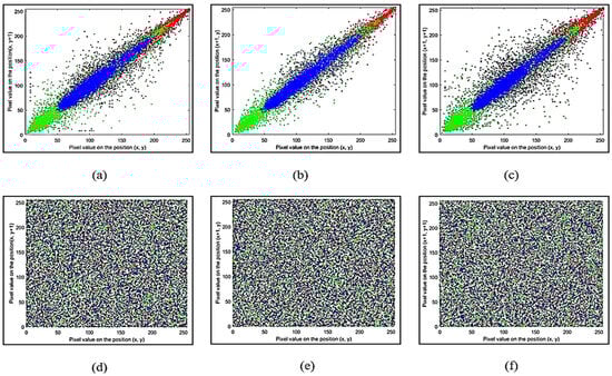 Plain image Red, Green, Blue channel correlation analysis: (a) horizontally, (b) vertically; (c) diagonally. Ciphered image Red, Green, Blue channel correlation: (d) horizontally, (e) vertically; (f) diagonally.