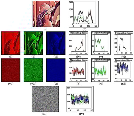 (I) Original image; (II) original image histogram; (i) original image red-layer; (ii) original image green-layer; (iii) original image blue-layer; (iv) original image red layer histogram; (v) original image green layer histogram; (vi) original image blue layer histogram; (vii) encrypted image red layer; (viii) encrypted image green layer; (ix) encrypted image blue layer; (x) encrypted image red layer histogram, (xi) encrypted image green layer histogram, (xii) encrypted image blue layer histogram (III) encrypted combined image; (IV) encrypted image combined histogram.
