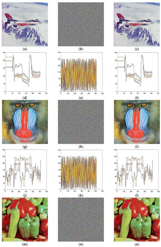 (a–c) Original, encrypted, and decrypted image of aeroplane, (d–f) aeroplane original, encrypted and decrypted image histograms, (g–i) original, encrypted and decrypted image of baboon, (j–l) baboon original, encrypted and decrypted image histograms, (m–o) original, encrypted and decrypted image of peppers, (p–r) pepper original, encrypted and decrypted image histograms, (s–u) original, encrypted and decrypted image of house, (v–x) house original, encrypted and decrypted image histogram.