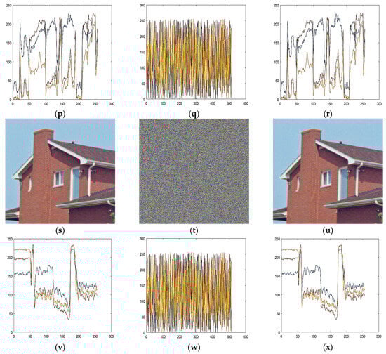 where the average values for and are represented as and and their variances and covariance are represented by and and represents a weak denominator value for stabilized division. For the pixel dynamical values that are signified by l, the values are (0.01, 0.03). The results of MSE, PSNR, and SSIM for the proposed “Lena” ciphered and original images and their comparison are given in Table 9. It is clearly depicted from the resulting values that the SSIM ciphered image values are nearest to zero, whereas PSNR is lesser than 10 dB and the values of MSE are greater. This indicates that the ciphered images using the proposed technique are low quality, which means that it is quite difficult to recognize the original image from the ciphered ones. Furthermore, from the comparison result of Lena’s image, it can be observed that the proposed scheme PSNR, SSIM, and MSE resulted in values that are better than others.