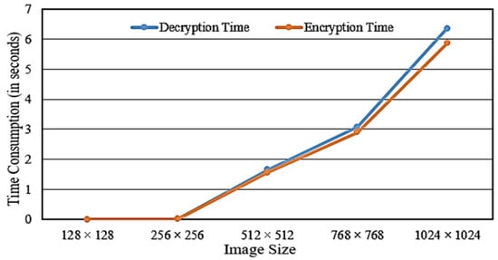 The proposed technique is implemented on MATLAB via a personal laptop with the following properties 12th: Gen Intel(R) Core(TM) i7-1255U 1.70 GHz with 8.00 GB RAM. Different image ciphering and deciphering times are recorded and the results are given in Figure 11.