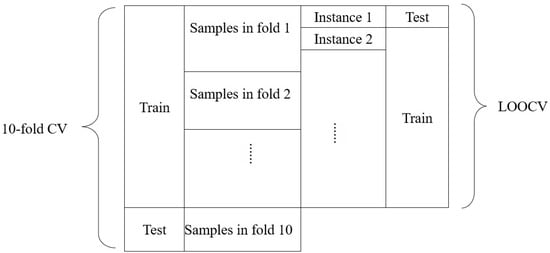 We used a 10-fold CV in our experiments to make the results more objective, and we used the LOOCV error as a criterion for model selection. Figure 1 describes the relationship between LOOCV and 10-fold CV. The test set in the 10-fold CV loops through the 10 folds of samples. At the same time, the test instance in LOOCV loops through all the LOOCV instances.