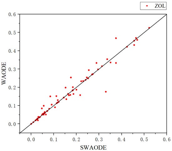 We also represented the scatter plot of SWAODE with respect to WAODE-MI in terms of ZOL in Figure 2. Points above the diagonal represent datasets whose ZOL values are lower than those of WAODE-MI. It can be found that SWAODE consistently provided better predictions than the regular WAODE-MI in a statistically significant way.