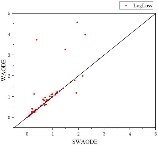 Meanwhile, we also represented the scatter plot of SWAODE with respect to WAODE-MI in terms of LogLoss in Figure 3. It can be found that SWAODE consistently provided better predictions than the regular WAODE-MI algorithm in a statistically significant way.