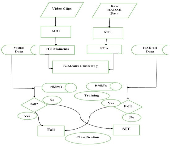 Process flow diagram for human motion classification using radar and imaging methods.