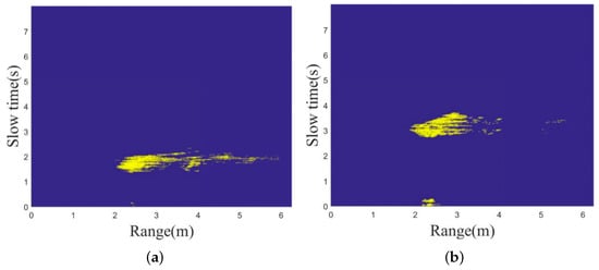 Filtered radar images demonstrating the enhanced distinction between falling and sitting motions. (a) Radar image corresponding to falling. (b) Radar image corresponding to sitting.
