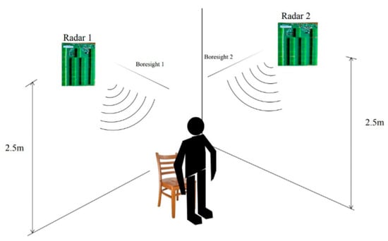 To achieve comprehensive coverage and enhance detection accuracy, we employ multiple Radar sensors strategically placed around the environment. This setup allows for capturing a 360-degree view of human motion, significantly improving the reliability of motion detection. We analyze how the integration of data from multiple radars can reduce ambiguity and improve the overall classification accuracy of different motion types. The first experiment uses two radars placed at opposite ends of the room, with their boresights perpendicular to each other, as shown in Figure 7. This arrangement captures the range variations in radar images for the same motion captured from different angles, offering insights into the spatial dynamics of detected motions.