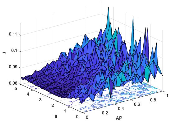 In the first step the range of parameter fl was from 1 to 5, and for AP it was from 0 to 1. These results were not sufficient to determine the most appropriate intervals, i.e., where J values were the lowest. For this, the interval for fl was increased to 0 to 5, and the step was also decreased from 1 to 0.1, as well as decreasing the AP step from 0.1 to 0.05. These results are presented as Supplementary Materials (Table S2). A 3D plot of the results is presented here in Figure 1.