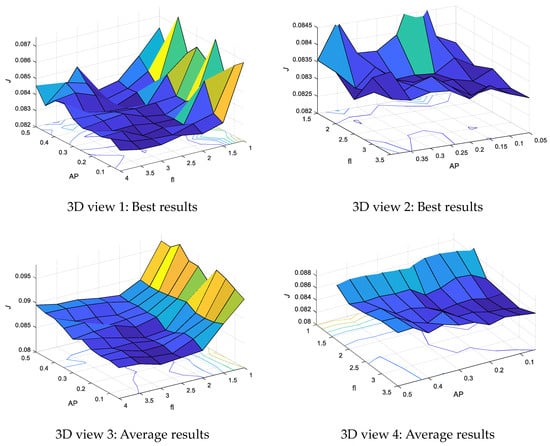 The obtained results are presented as a 3D plot in Figure 2; 3D view 1 and 3D view 2 show the obtained best results, and 3D view 3 and 3D view 4 show the resulting average results of J. Views 2 and 4 show the area of the surface where the lowest values of the objective function J were observed. The CSA provided the best results (lowest J value) for the following fl and AP ordered pairs: (2; 0.35) and (3; 0.15). The best average results were obtained at the combinations (3; 0.05) and (2.5; 0.1).