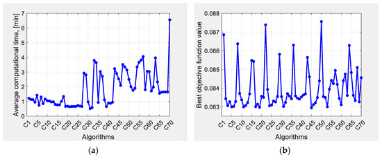 Comparison of the performance of the 70 differently tuned CSAs. (a) Average computational time. (b) Best objective function value.