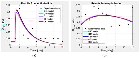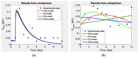 The models’ predicted dynamics for hydrogen and methane concentrations compared with the experimental data are presented in Figure 4. The models followed the data as best as possible, given that we had noisy and difficult real measurements, in the cases of both hydrogen and methane dynamics. Data collection could reduce or increase the quality of the results achieved by reducing the possible errors that may occur during sampling. Therefore, a lot of time must be spent on data collection to obtain relevant data. In the present study, obtaining data was a long and difficult process [48].