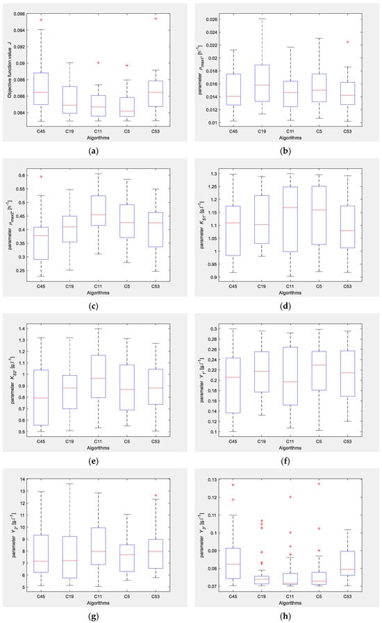 Box plot for the results based on 30 runs of each CSA: objective function and model parameter estimates. (a) Objective function J. (b) Model parameter . (c) Model parameter . (d) Model parameter . (e) Model parameter . (f) Model parameter . (g) Model parameter . (h) Model parameter . (i) Model parameter . (j) Model parameter .