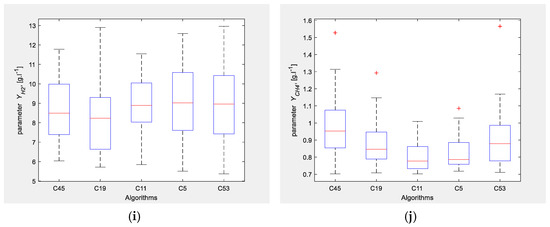 The estimated values of the model parameters were comparable to those found for similar processes [58]. Some examples of models with similar structures and parameter values are presented in [59,60,61,62]. Since there are no published results for the same process, the obtained parameter values were confirmed by the results in the case of similar processes. Considering Monod kinetics, the following values were estimated for : 0.05 and 0.12 in [58], 0.67 in [59], and 0.098 in [61]. These values corresponded to the estimates for obtained here. The published values of the yield coefficient were 0.3-0.67 [58] and 0.48-0.58 [60]. The values estimated here were 0.14-0.26 for (the yield coefficient in Equation (1)) and also corresponded to the published ones. For other yield coefficients (, , , and ), there were no published analogous models.