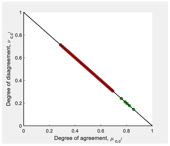 As a result of the ICrA application, an index matrix of intuitionistic fuzzy pairs (IFP) [54] is obtained. Each IFP is an estimation of the degrees of “agreement” (consonance) and “disagreement” (dissonance) between each two criteria, in this work between two considered algorithms. The IFP is an ordered pair of real non-negative numbers such that . The difference is considered as a degree of “uncertainty” [51]. Most simply, the higher value of means a stronger connection or similarity is observed between two selected criteria (algorithms).