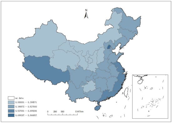 The results are presented in Table A1. With regard to the overall average THEI, the results suggest that the majority of Chinese provinces are not effectively engaged in high-quality development. The THEI of the provinces varied from 0.267 to 0.967, with an average value of 0.499. With regard to individual regions, the index was divided into five echelons using the natural break method, and the results are shown in Figure 1. Beijing and Shanghai are in the top tier. Beijing showed the best static high-quality development efficiency among all the provinces, with an average static efficiency score of 0.967. Shanghai ranked second, with an average static efficiency score of 0.837. On the other hand, Inner Mongolia showed the poorest static efficiency score of 0.267.