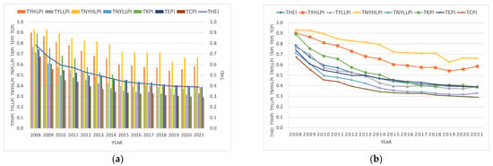 (a) Trend of THEI and histograms of its components; (b) Trends of THEI and its components. Notes: THEI (static total-factor high-quality development efficiency index), TYHLPI (performance index of young labor with higher education), TYLLPI (performance index of young labor without higher education), TNYHLPI (performance index of other labor with higher education), TNYLLPI (performance index of other labor without higher education), TKPI (static total-factor capital performance index), TEPI (static total-factor energy performance index), and TCPI (static total-factor CO2 emission performance index).