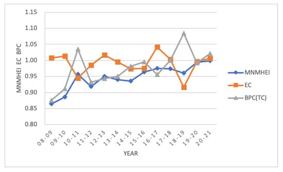 From 2008 to 2020, the EC index and the TC index show opposite trends; for example, during the period 2008–2010, the EC index rose while the TC index declined. The decline in TC was greater than the rise in EC, so the MNMHEI was more affected by TC and also declined. During the period 2010–2011, the EC index declined while the TC index rose. The rise in TC was greater than the fall in EC, so the MNMHEI was more affected by TC and also rose. In brief, the MNMHEI was more affected by TC during 2008–2020.