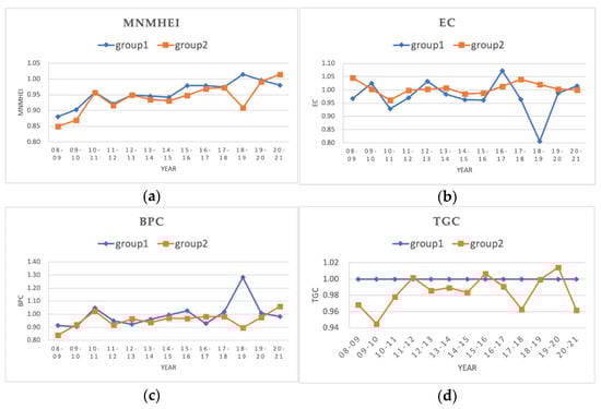 (a) Trends in the MNMHEI into two groups; (b) Trends in the TC into two groups; (c) Trends in the BPC into two groups; (d) Trends in the TGC into two groups.