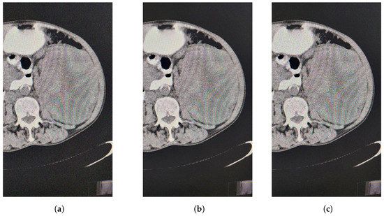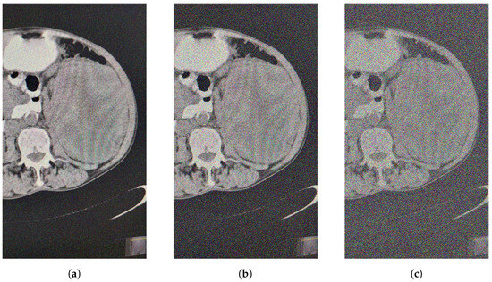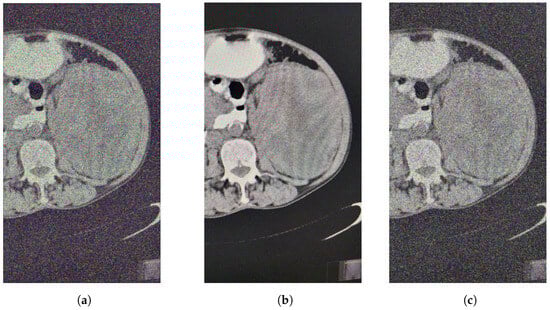 The previous experiments involved filtering images noised with different percentages of salt and pepper noise using the median filter (VMF) and the fuzzy filter (FF). Now, we apply other types of noise (Figure 4a–c), to the same original image Figure 1 using the appropriate functions in the MATLAB package.