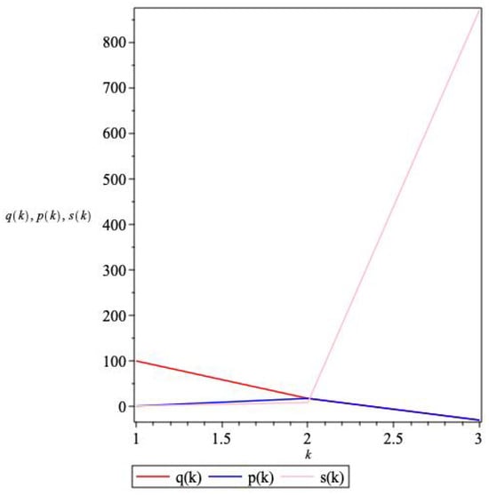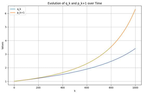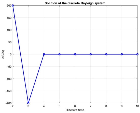 We integrate (99) numerically with a first-order Euler method and fixed step . The choice of a not-so-relatively small h is due to instability or numerical oscillations of the first-order Euler method. We represent the momentum versus the discrete-time step with conditions for and . It is easy to see that the Rayleigh systems end up losing all the momentum stored and the oscillations tend to zero because of dissipation. One can check a more precise simulation in [60], but even a few-step integration like ours already shows the same qualitative behavior that our collaborators previously detected in [60] (Figure 5).