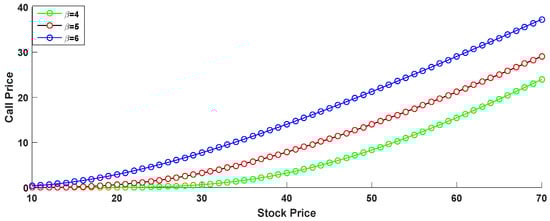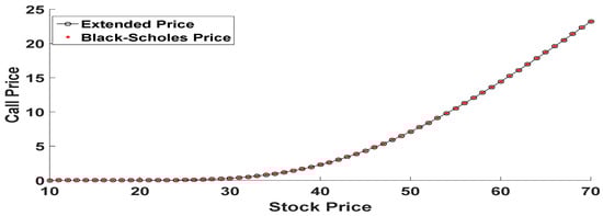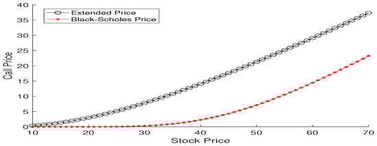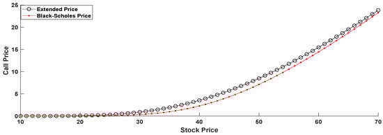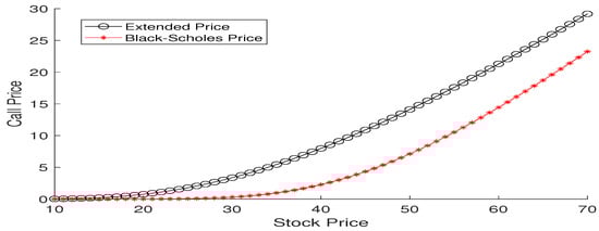 The call option price under extended normal distribution along with Black–Scholes is plotted in Figure 1, with skewness () and kurtosis ().