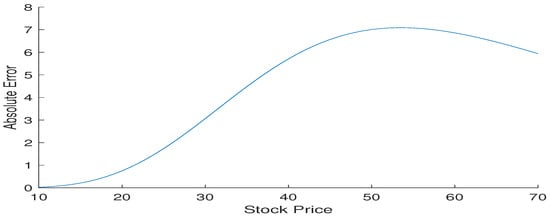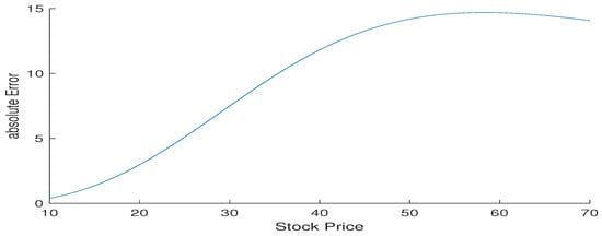 In order to have greater insight, the absolute error of the option price given by Black–Scholes and that of Ki et al. [] is shown in Figure 3.