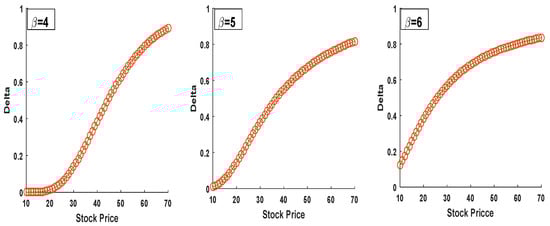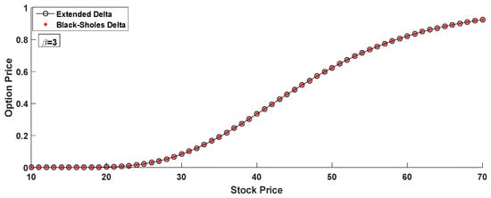 This sensitivity represents the variation in option premium corresponding to the change in stock price []. More clearly, if Delta for a particular stock is 0.35, then each one-unit increase in the stock price results in a 0.35 increase in the option price. It has been observed that Delta always provides positive and negative values for call and put options, respectively. The minimum and maximum values of call delta are 0 and 1, respectively, whereas that of put delta are −1 and 0. The sum of absolute values of call Delta and put Delta always gives one. This shows the minimum and maximum values of call delta are 0 and 1, respectively, whereas that of put delta are −1 and 0, which satisfies the put-call parity relationship. Thus, under extended normal distribution, Delta is computed as