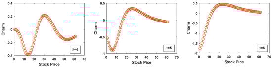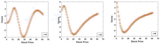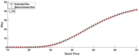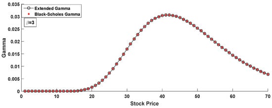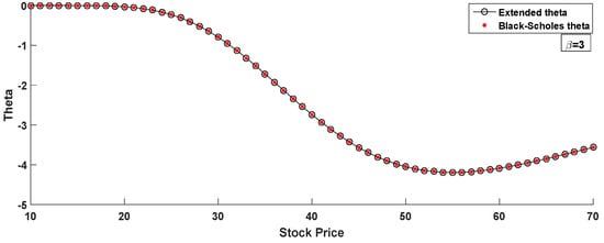 The plot of Delta, Gamma, Theta, Rho, Vega, Vanna, Charm, and Vera under the extended normal distribution, along with Black–Scholes Delta, Gamma, Theta, Rho, Vega, Vanna, Charm, and Vera, are shown in Figure 10, Figure 11, Figure 13, Figure 15, Figure 17, Figure 19, Figure 21 and Figure 23, respectively, for . It is observable that all of the corresponding plots are in close agreement with each other. The results provided in this study are numerical simulations; however, researchers can exploit actual data (which can be expensive) by applying web-harvesting algorithms as deployed by Agrrawal [] to add empirical tests to these results.