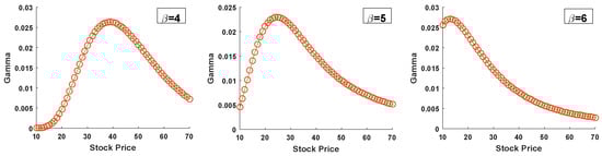 This sensitivity is defined as the rate of variation of Delta corresponding to the stock price []. It is also obtained by taking the double derivative of the option price under the stock price. Unlike Delta, Gamma always provides positive values for both call and put options. However, both call and put have the same Gamma values. Gamma attains its maximum when the stock price reaches the strike price.