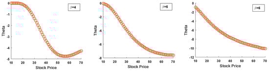 This sensitivity measure gives an idea about the price change for change in time remaining towards the expiration. It has been noticed that whenever expiration approaches, both call and put Theta decrease. Therefore, this measure always reflects negative values []. Keeping the stock price, interest rate, and volatility of underlying assets constant, Theta will show the number of options declined. Option Theta behaves differently at the money, in the money, and out of the money option. If the expiration approaches towards in in-money or out-of-money option, the option premium increases. However, if the expiration for out of the out-of-the-money option is far away, the option premium goes on decreasing.