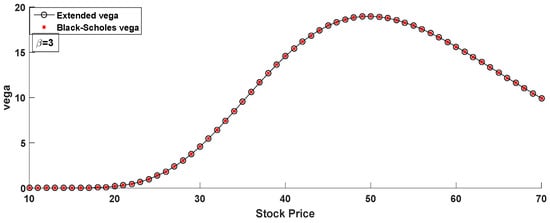 Extended Vega along with Black–Scholes Vega for T = 1,  = 10,  = 0.3, r = 0.05 and K = 50.