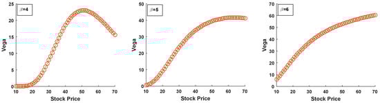 This Greek corresponds to the implied volatility of the underlying stock price. It represents the variation in option price corresponding to the variation in the implied volatility of the stock price []. The difference between stock price and strike price is independent of this option Greek. However, it has a significant impact on the time value of money.
