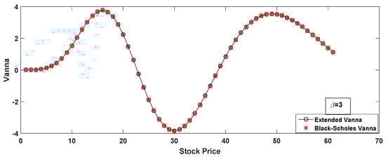 Vanna may be defined as the rate of change of Delta corresponding to the fluctuation parameter volatility. This Greek is generally applicable for the generation of the Delta–hedge ratio or Vega–hedge ratio. Basically, portfolio holders use such types of option Greeks. This sensitivity measure relies on the affinity between the price change and volatility change. Figure 19 Extended Vanna along with Black–Scholes Vanna for T = 1,  = 10,  = 0.3, r = 0.05 and K = 50. Figure 20 represents the graph of call Vanna under extended normal distribution for different kurtosis values. We have shown the Vanna values in Table 2 for different kurtosis.