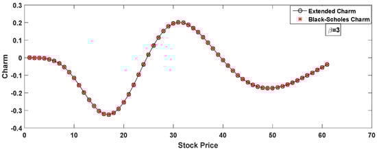 Extended Charm along with Black–Scholes Charm for T = 1,  = 10,  = 0.3, r = 0.05 and K = 50.