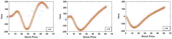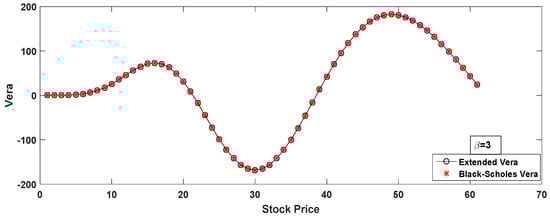 Figure 23 presents the extended Vera along with Black–Scholes Vera for T = 1,  = 10,  = 0.3, r = 0.05 and K = 50. Figure 24 represents the graph of call Vera under extended normal distribution for different kurtosis values. We have shown the Vera values in Table 3 for different kurtosis.