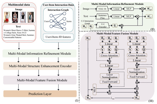 (I) The overall framework. (II) The multimodal information refinement method enhanced by item and interaction user ID features. (III) The multimodal feature fusion module based on cross-attention mechanism.
