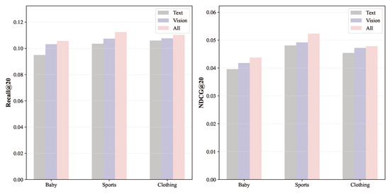 To investigate the impact of different modal information inputs on the performance of the recommendation model, we conducted experiments under three different modal inputs: text information input, image information input, and a combination of text and image information inputs. As shown in Figure 2, both text and image modal inputs could effectively enhance the model’s performance, but the performance improvement was more significant with image information. This indicates that effectively handling noise in multimodal information can significantly boost model performance. This may be because, in real-world scenarios, people tend to rely more on images when shopping, as visual impact is more pronounced. In contrast, textual descriptions are less direct and often contain irrelevant information, making it difficult for users to immediately find the needed information and requiring further filtering and processing of the text.