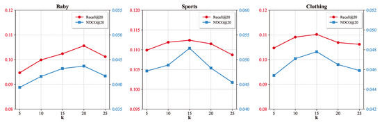For the multimodal semantic neighbors of items, we selected only the top k features with the highest similarity to minimize the introduction of noisy neighbors. To examine the effect of neighbor quantity k on model performance, we adjusted the value of k in the proposed CAmgr, selecting {5, 10, 15, 20, and 25} as candidate values, and observed their impact on Recall@20 and NDCG@20. As shown in the experimental results in Figure 3, the k value of 20 yielded the best results for the baby dataset, while the k value of 15 was optimal for the other datasets. These findings suggest that the number of multimodal semantic neighbors k should not be too large, as a larger value may introduce irrelevant items as neighbors, thereby increasing noise.