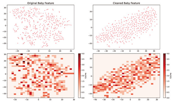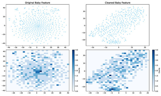 We visually analyzed the multimodal information denoising enhancement method proposed in this paper, and visualized the modal features before denoising and the enhanced features after denoising. We randomly selected 500 items from the baby dataset, and reduced the high-dimensional modal features to a two-dimensional plane using a nonlinear dimensionality reduction method called tSNE. Then, we used two-dimensional histograms to further visualize. Figure 4 and Figure 5 show our visual results. By analyzing the distribution of two-dimensional features, we can see that the modal information before denoising is not evenly distributed in the two-dimensional histogram, there are many outliers and many high-density regions. After noise reduction, the feature distribution is more uniform, and the color distribution of outliers and two-dimensional histograms is more balanced. By comparing FIG. 5 and FIG. 6, it can also be seen that the distribution of image features is more uniform than that of text. Therefore, in the ablation experiment of the modal information input, it was found that the impact of image information on model performance was greater than that of text information.