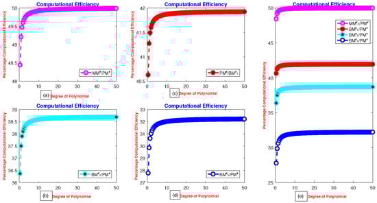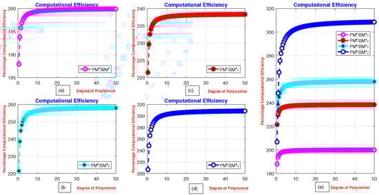 Figure 1a–d presents the percentage computational efficiency ratios of MMϵ, with respect to PMϵ, BDϵand, respectively. Meanwhile, Figure 2a–e illustrate the computational efficiency of MMϵ, BDϵ, EMϵ, BMϵ, and DFϵ relative to the PMϵ technique. The computational efficiency curves clearly demonstrate that the newly developed method is more efficient and consistent than the PMϵ method.