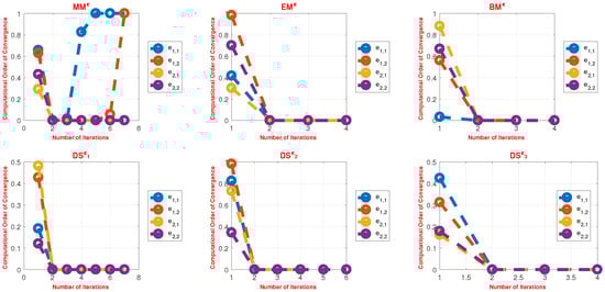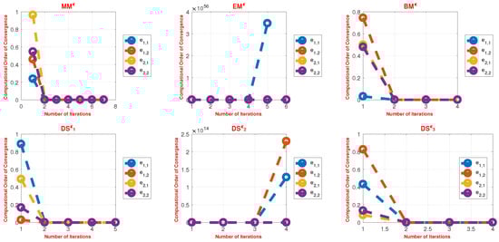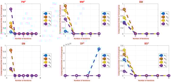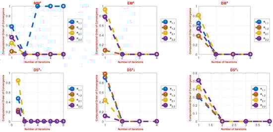 where represents the absolute error using the Euclidean norm-2, i.e., [70,71]. In the numerical calculations, we utilized vectors v1–v3 from Appendix A Table A1, Table A2 and Table A3 for (29) and abbreviated as , , and , respectively. The numerical outcomes considered the following points to analyze the simultaneous schemes PMϵ, MMϵ, BDϵ, BMϵ, DFϵ, and DSϵ: