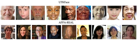 The only preprocessing steps applied to these images involved scaling them to a size of 224 × 224 × 3, as required by the VGG19 model [25], and using its preprocess_input function, which centers the color channels at zero and converts the images from RGB to BGR. Figure 1 shows a few example images from both the UTKFace and APPA-REAL datasets.