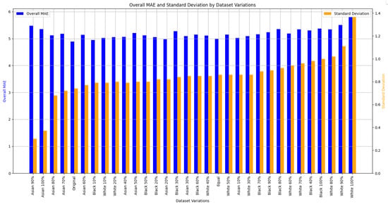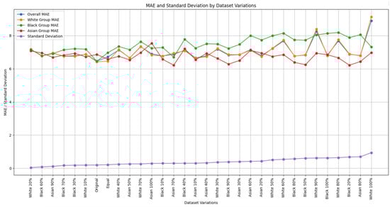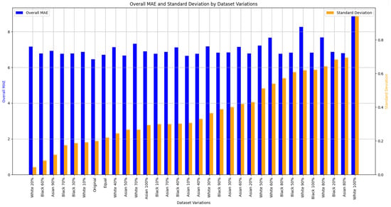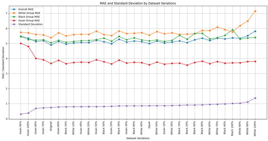 The worst-performing model was trained with the dataset composition where the White group was completely omitted, resulting in an overall MAE of 8.89 and a standard deviation of 0.94. In comparison, the most equal model had a 95.74% smaller variation. Table 3 presents these results, sorted by the least standard deviation.