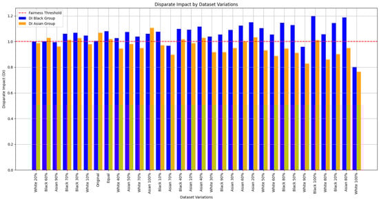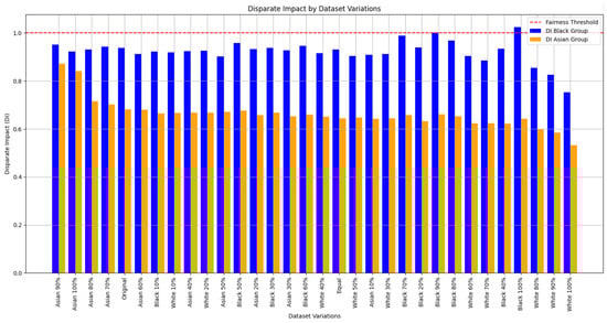 In contrast, the Equal Dataset Variation, despite equalizing the sample sizes, has DI values of 0.9315 for the Black group and 0.6439 for the Asian group, reflecting some bias. The worst performing model in terms of DI is the White 100% variation, with DI values of 0.7536 for the Black group and 0.5316 for the Asian group, indicating significant bias. Figure 9 shows the Disparate Impact for the Black and Asian groups across various dataset variations.